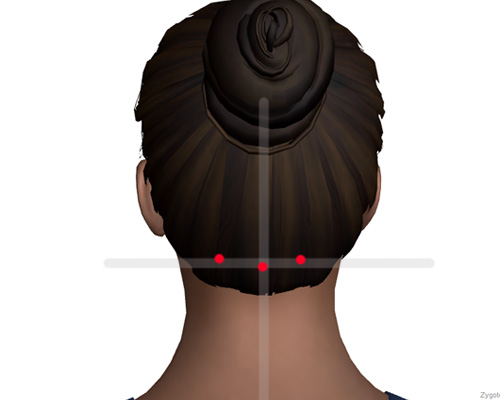 Переходим на затылок: массируем точки, которые находятся в точности у основания затылочных бугров, затем ямку у основания черепа (посередине и чуть ниже между предыдущими точками).