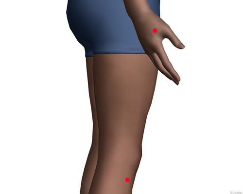После этого переходим к рукам: массируем поочердно точки "хэ-гу" между большим и указательным пальцами, потом переходим к точкам, которые находятся сбоку от коленных чашечек.